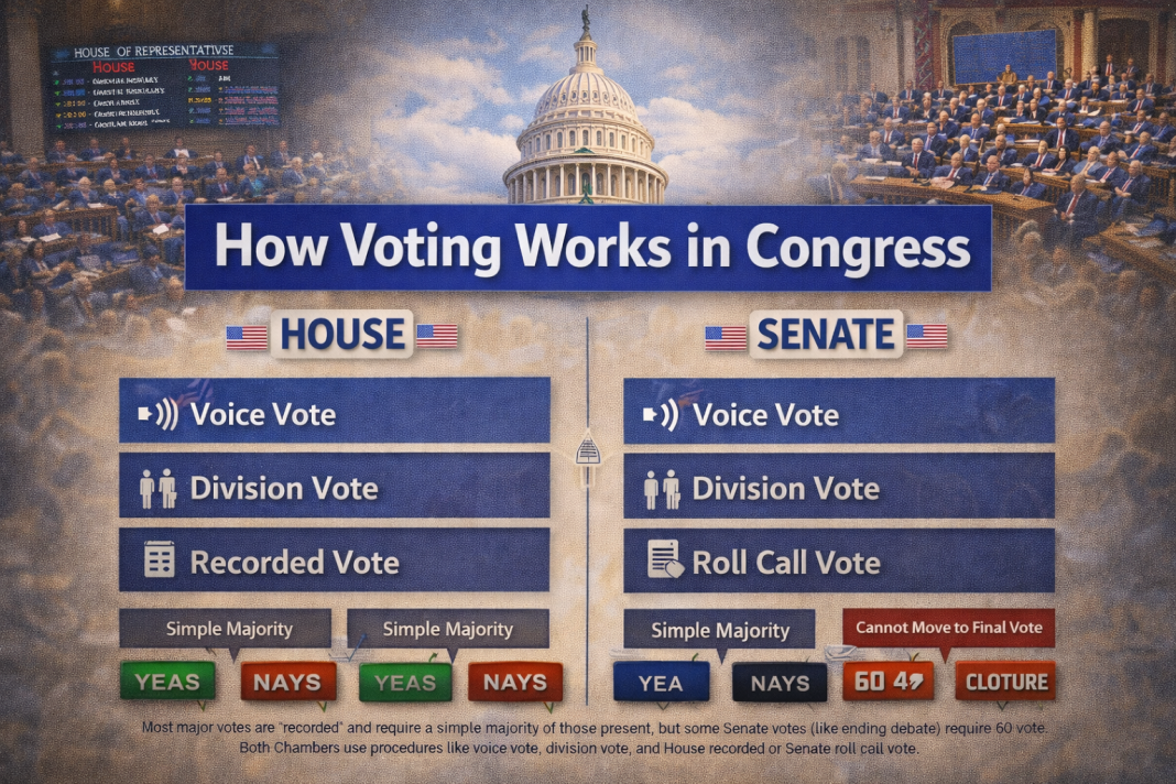 Both chambers use a mix of informal and formal voting procedures, from quick voice votes to detailed roll call votes that record each memberโs position. These mechanisms reflect not just the rules of procedure, but also strategic choices by leadership and individual members about how and when to push for public accountability on key issues.